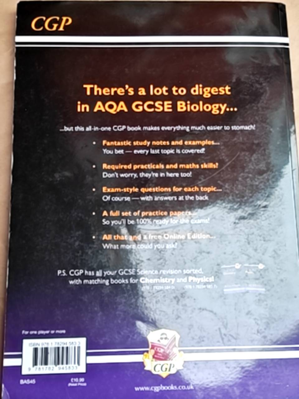 Description Exam Board: AQA Level & Subject: GCSE Biology First Teaching: September 2016 First Exams: June 2018 This CGP Complete Revision & Practice book covers every topic from Grade 9-1 AQA GCSE Biology. Everything’s explained with clear, easy-to-read study notes, examples and diagrams, with brilliant coverage of the new required practicals, maths skills and Working Scientifically. There’s also a huge range of practice questions and exam-style questions in every section (with answers included at the back), plus plenty of useful advice for scoring top marks in the final exams - and the book is rounded off with a full set of realistic practice papers. We’ve even included a code that gives you access to a free Online Edition of the whole book! Separate CGP Complete Revision & Practice books are available for AQA GCSE Chemistry (9781782945840) and GCSE Physics (9781782945857).